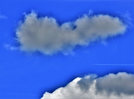 An aeroplane passes between clouds.