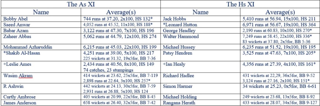 Among the top five only Babar Azam for the As has a better batting average than his opposite number. Miller comes out slightly below Al Hasan on the batting front, way ahead on the bowling front. I suspect he was also the finer captain. Ames has an advantage on the batting front among the keepers, but Marsh was one of the greatest keepers ever to play the game. Marshall, McGrath and Mahmood a certainly a capable match for Akram, Ambrose and Anderson. Murali comfortably wins the battle of the off spinners on the bowling front, though Ashwin’s batting partly compensates for this. Additionally the Ms have a sixth bowling option, Charlie Macartney, who did win his country a match with the ball in hand. Miller once switched to off breaks on a Brisbane ‘sticky dog’, and took seven wickets, so even producing a raging bunsen for the benefit of Ashwin and Al Hasan might not be enough for the As. I find it hard to see any situation in which the As come out on top in this clash and accordingly score it As 0 Ms 5.