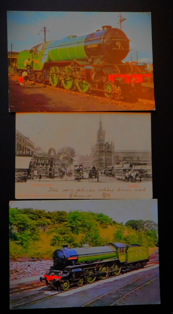 I mentioned lot 731 in my post about the coin/ banknote/ cheque element of James and Sons’ most recent sale (see here) but that was one of three lots (all very cheap) that I secured over the two days. Lots 369 and 374, railway postcards, went under the hammer while I was at work, but I had put in bids in advance. This gallery shows those lots, and my subsequent treatment of them.