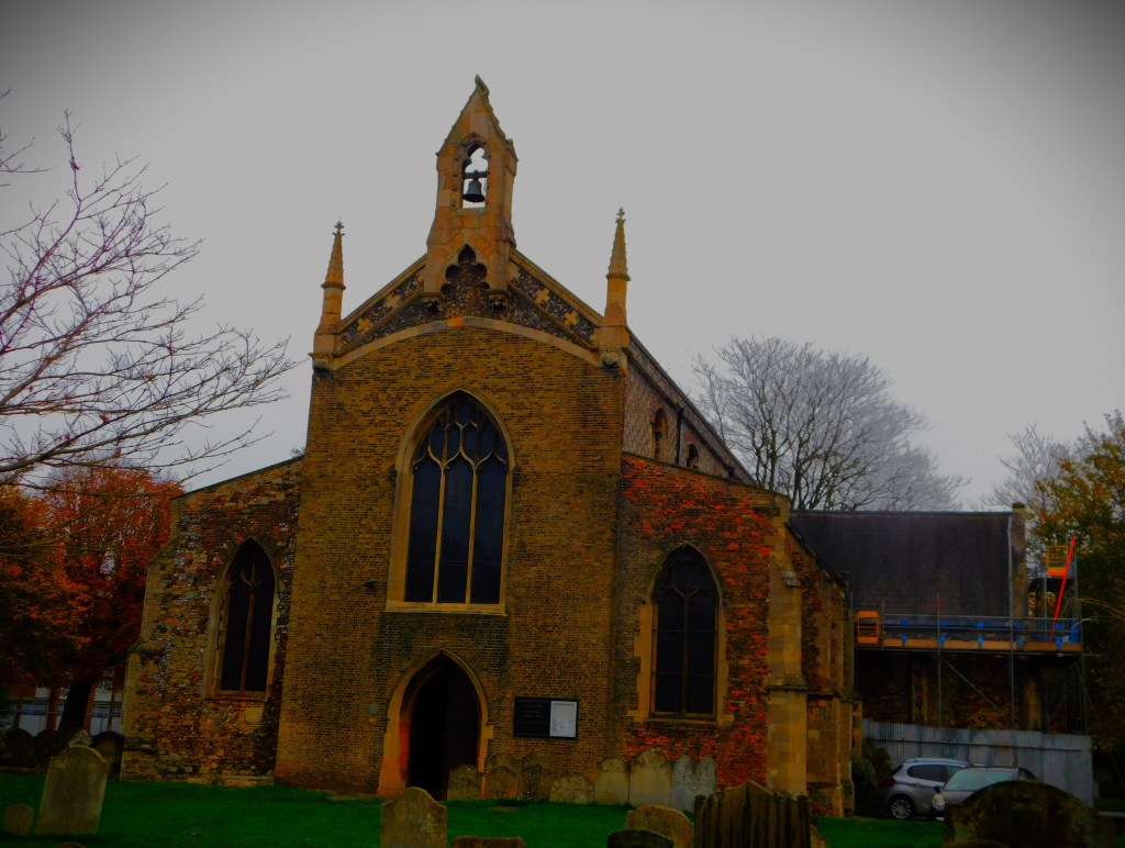 From here I headed on to a dike which can be muddy, but as we have had little rain of late I knew would be fine, and followed it until the path bifurcated – one route led to more of the Great Ouse, and the possibility of following that river as far as Purfleet Quay, but on this occasion i took the other, heading across another part of Hardings Way, through a gateway and down a side road which leads to play area that is at the meeting point of several roads, one of which leads to All Saints Church, reckoned to be the oldest church in King’s Lynn and then by way of Hillington Square to Millfleet.