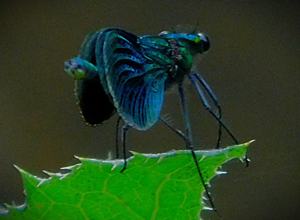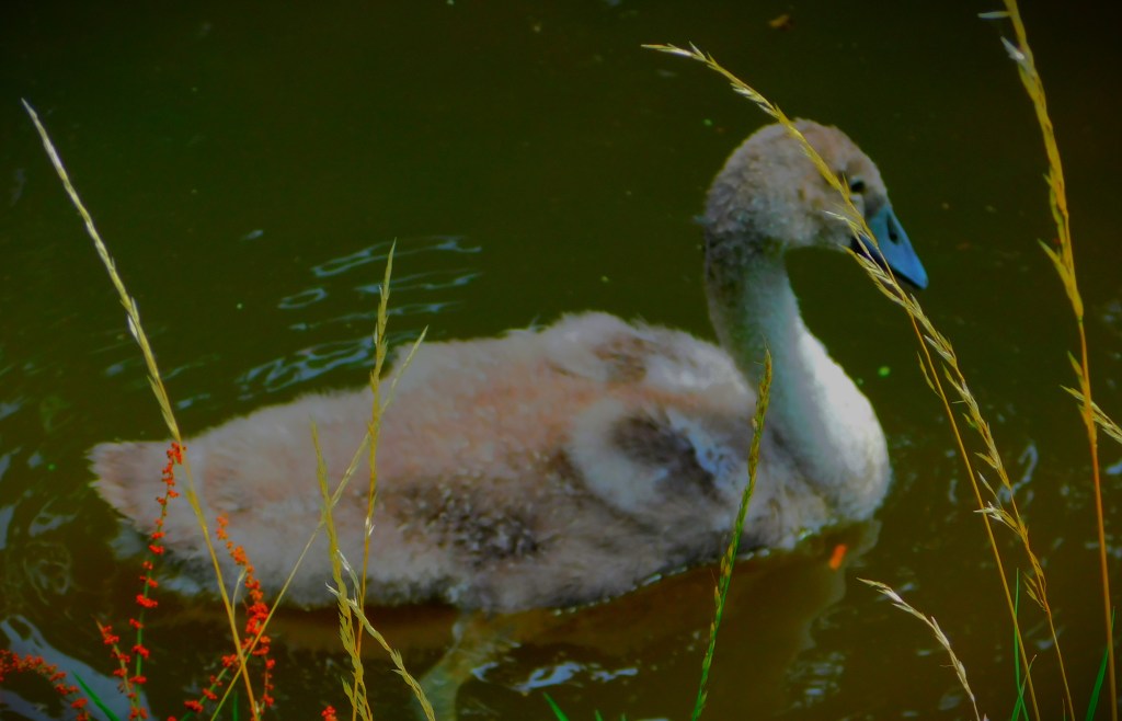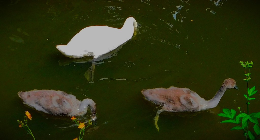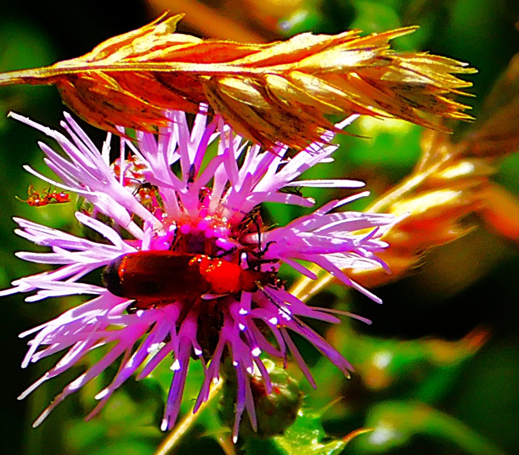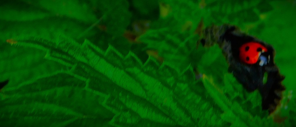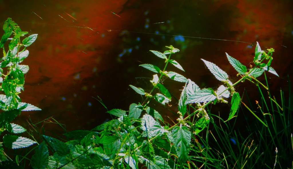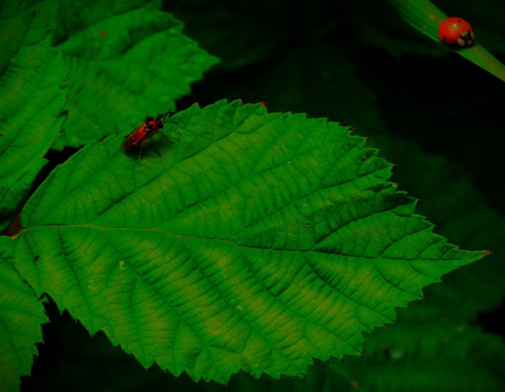 I have previously been guilty of mislabelling this – it is not a Cinnabar Moth, it is a six-spot Burnet Moth.This picture and the next, a close up focussing on the insects (two six-spot Burnet moths and one large buff tailed Bumblebee) have already had some success on Mastodon.A dragon fly balanced on a leaf overlooking one of the sections of the Gaywood in The Walks.A precarious resting spot – this reed is entirely surrounded by the waters of the Gaywood, near Eastgate Bridge.