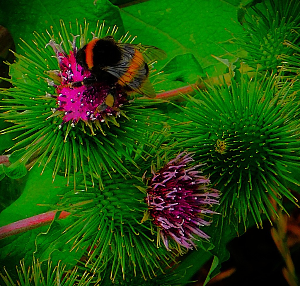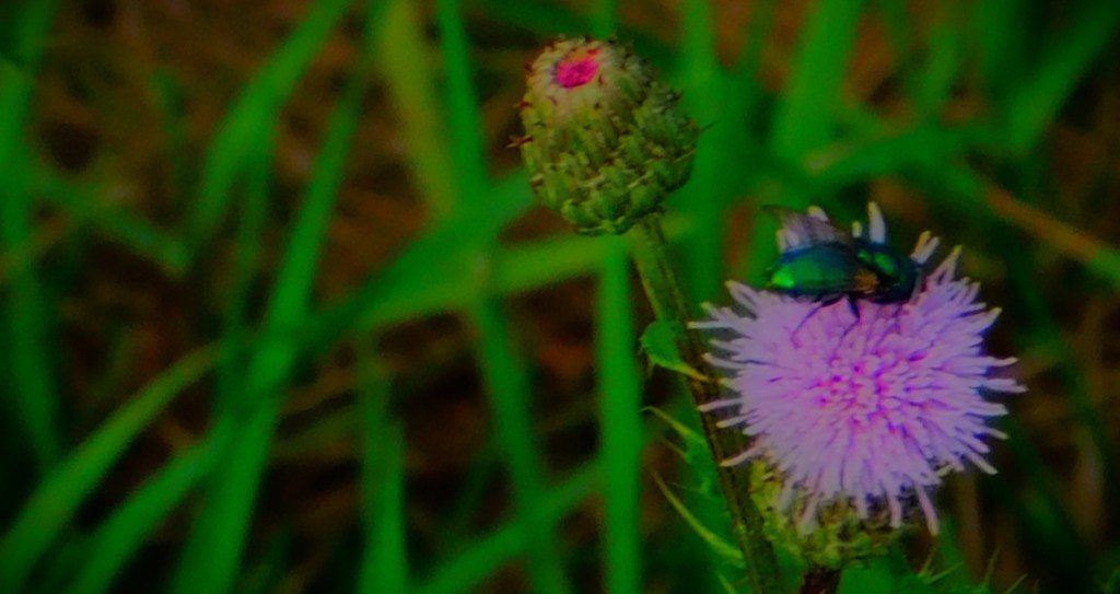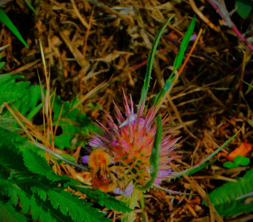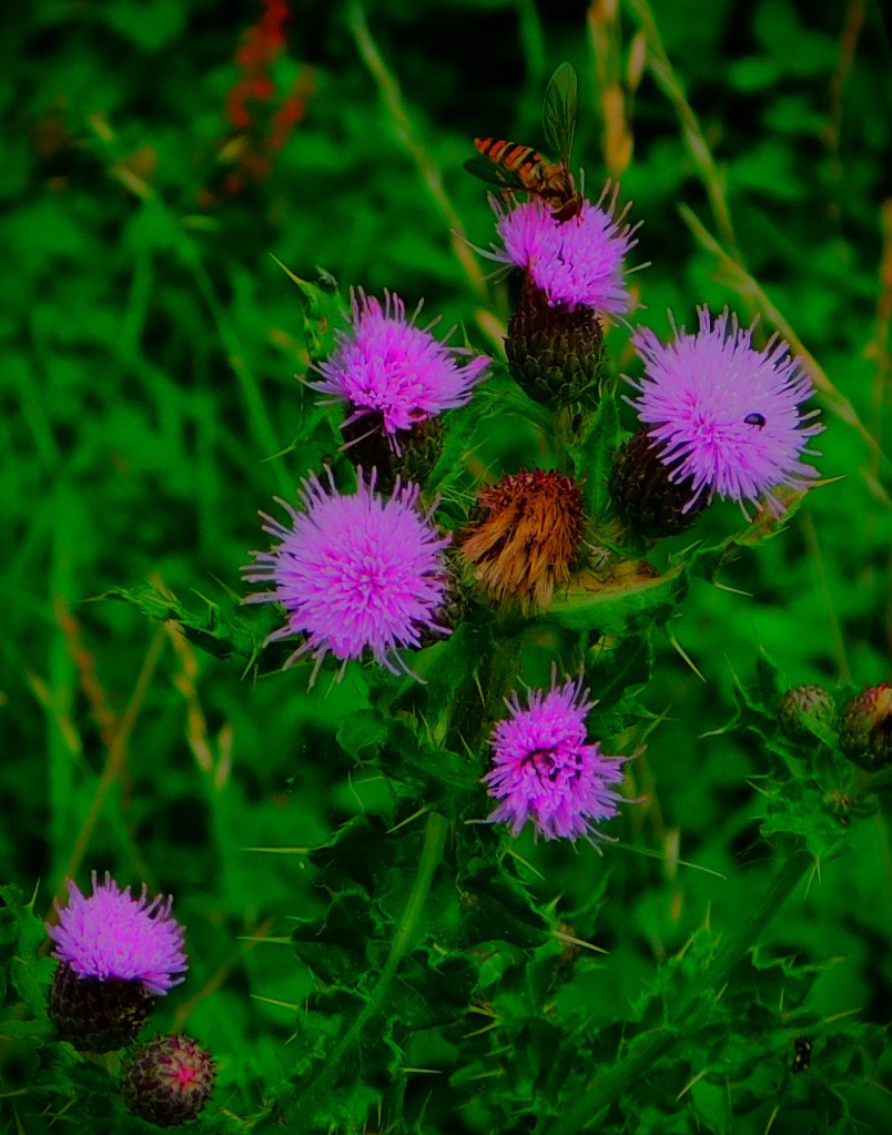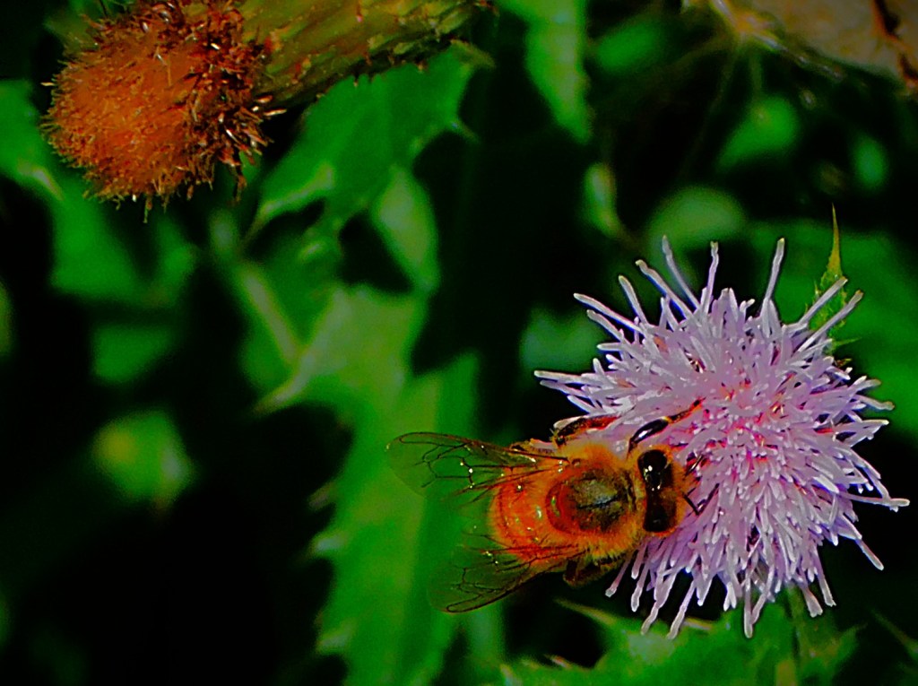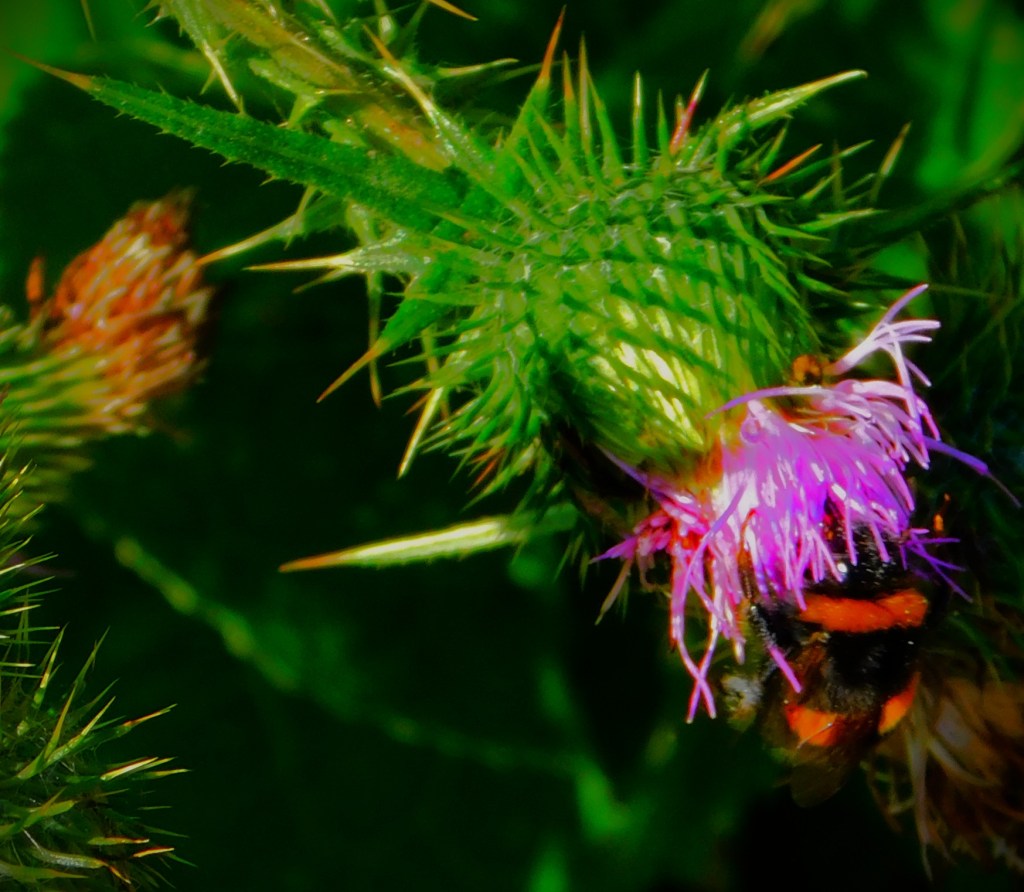 I have an ID on this little green critter of ‘inchworm’. the larval stage of a certain species of moth (six photos total, two of them after I had orchestrated its transfer to a buddleia branch).I usually focus on the teazel heads, and the insects enjoying them, but this is a shot of a whole teazel plant.
