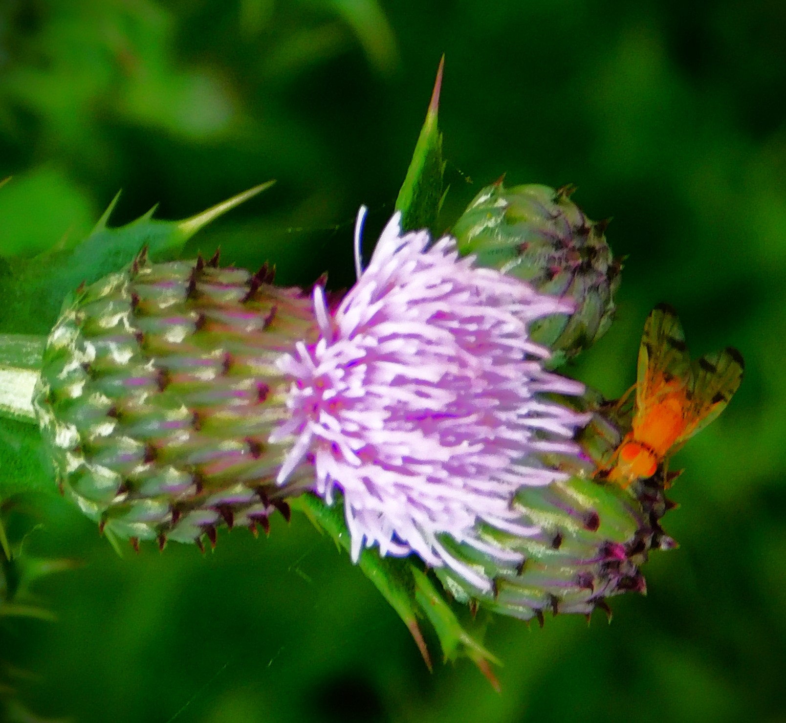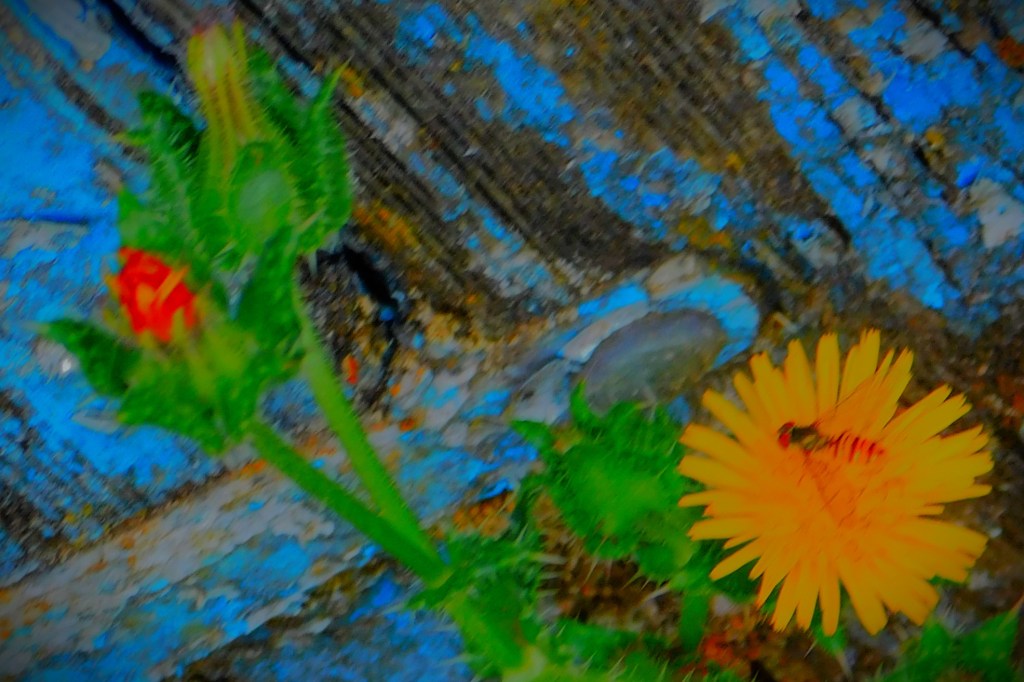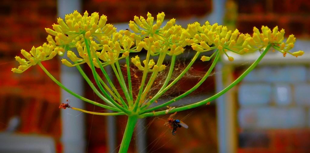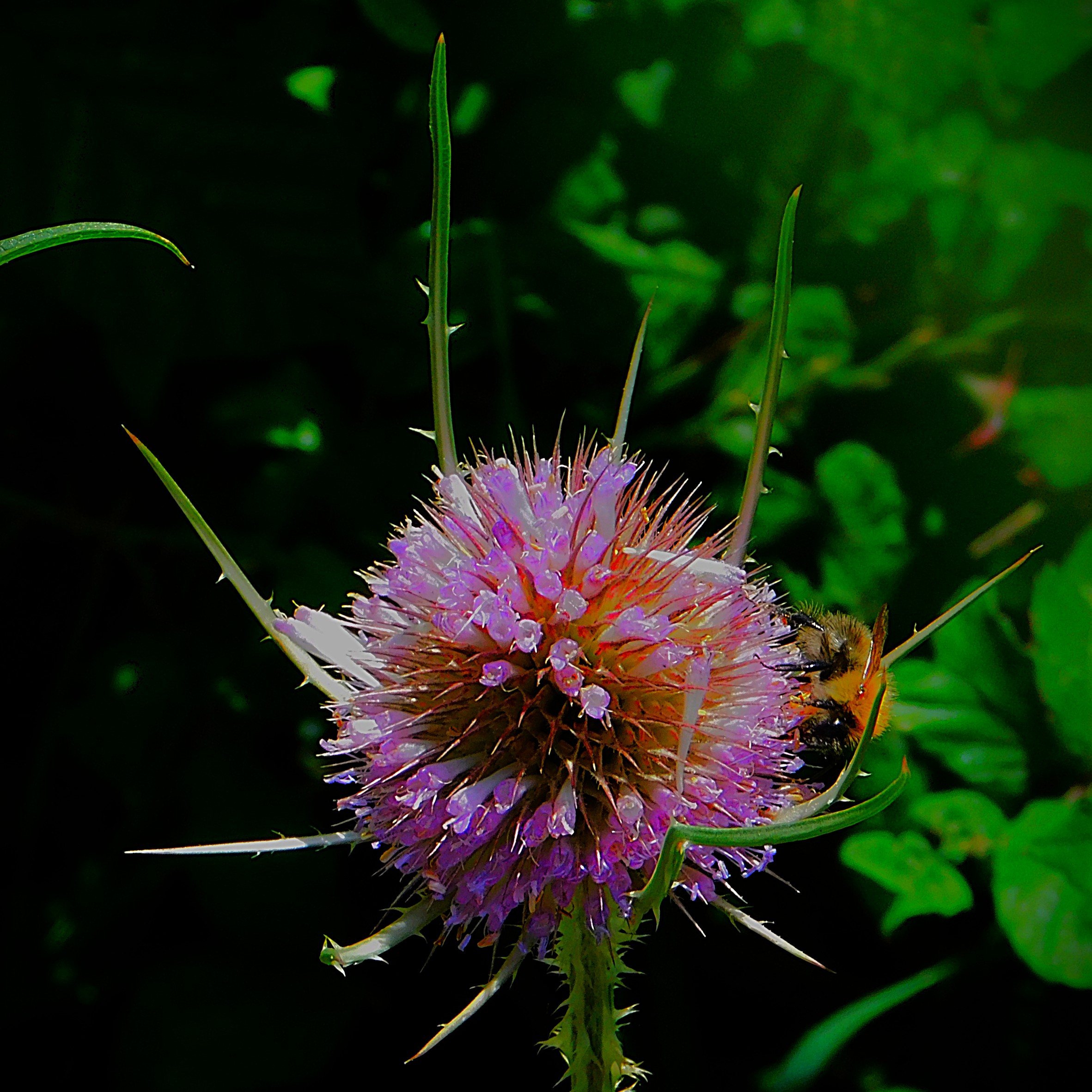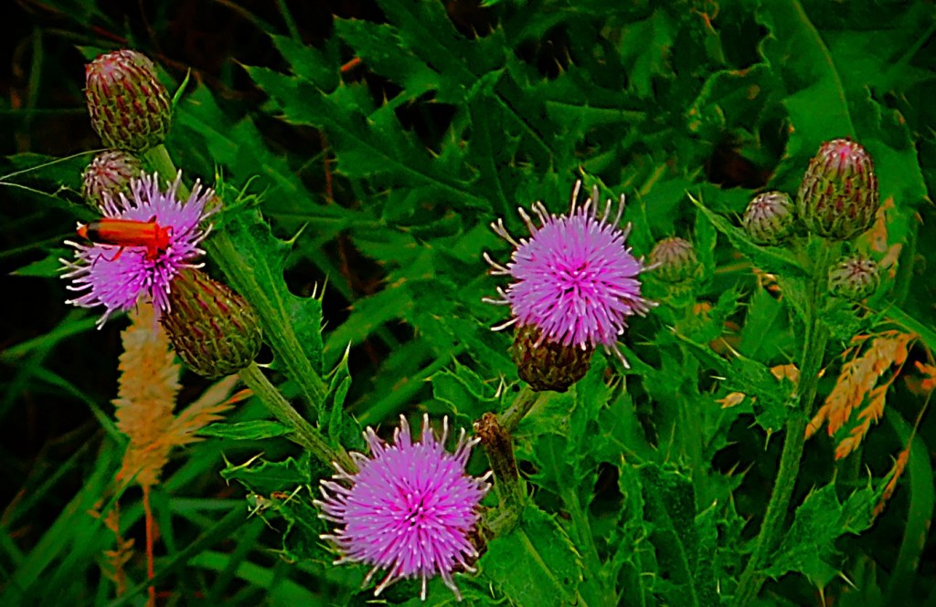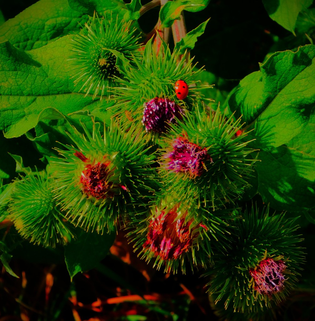 I have an ID on this little green critter of ‘inchworm’. the larval stage of a certain species of moth (six photos total, two of them after I had orchestrated its transfer to a buddleia branch).I usually focus on the teazel heads, and the insects enjoying them, but this is a shot of a whole teazel plant.