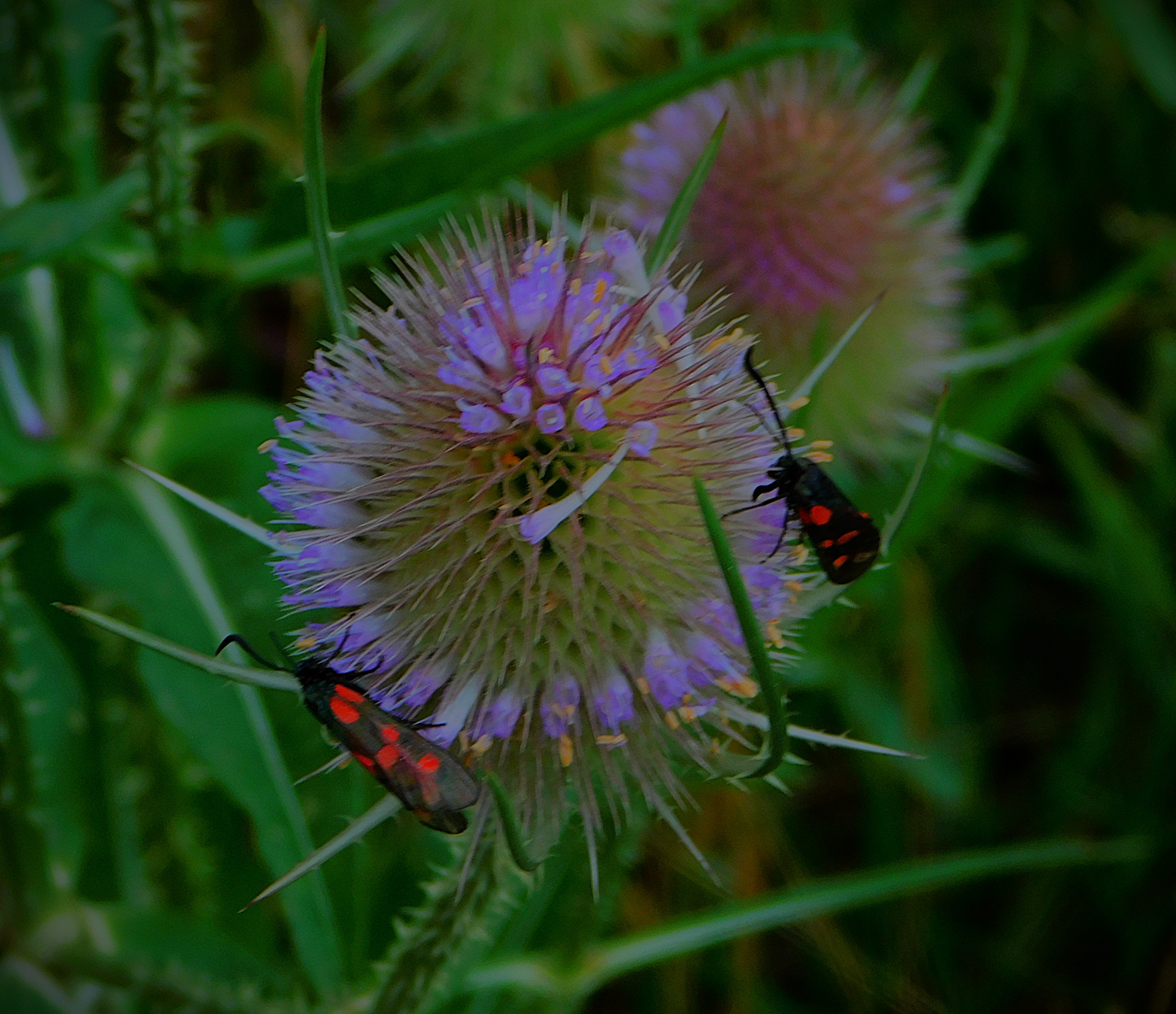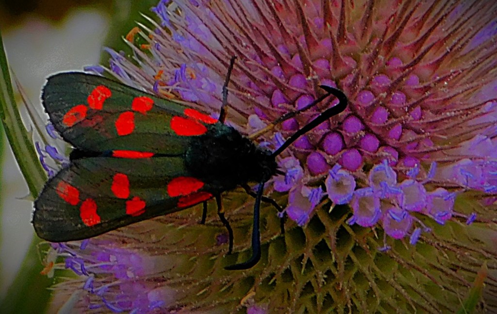 There was a little rain yesterday after a long dry spell, and it brought the snails out.This picture and the five that follow all feature plants that fell victim to ‘grounds maintenance’ shortly after I took the pictures this morning.The last six pictures, including this one offer a preview of my next gallery. This hare was in the woodland section of Salter’s Sanctuary, a small nature reserve in the North Lynn area.A cinnabar moth (yes, there are such things as diurnal moths) enjoying a teazel plant.A close up of the cinnabar moth.