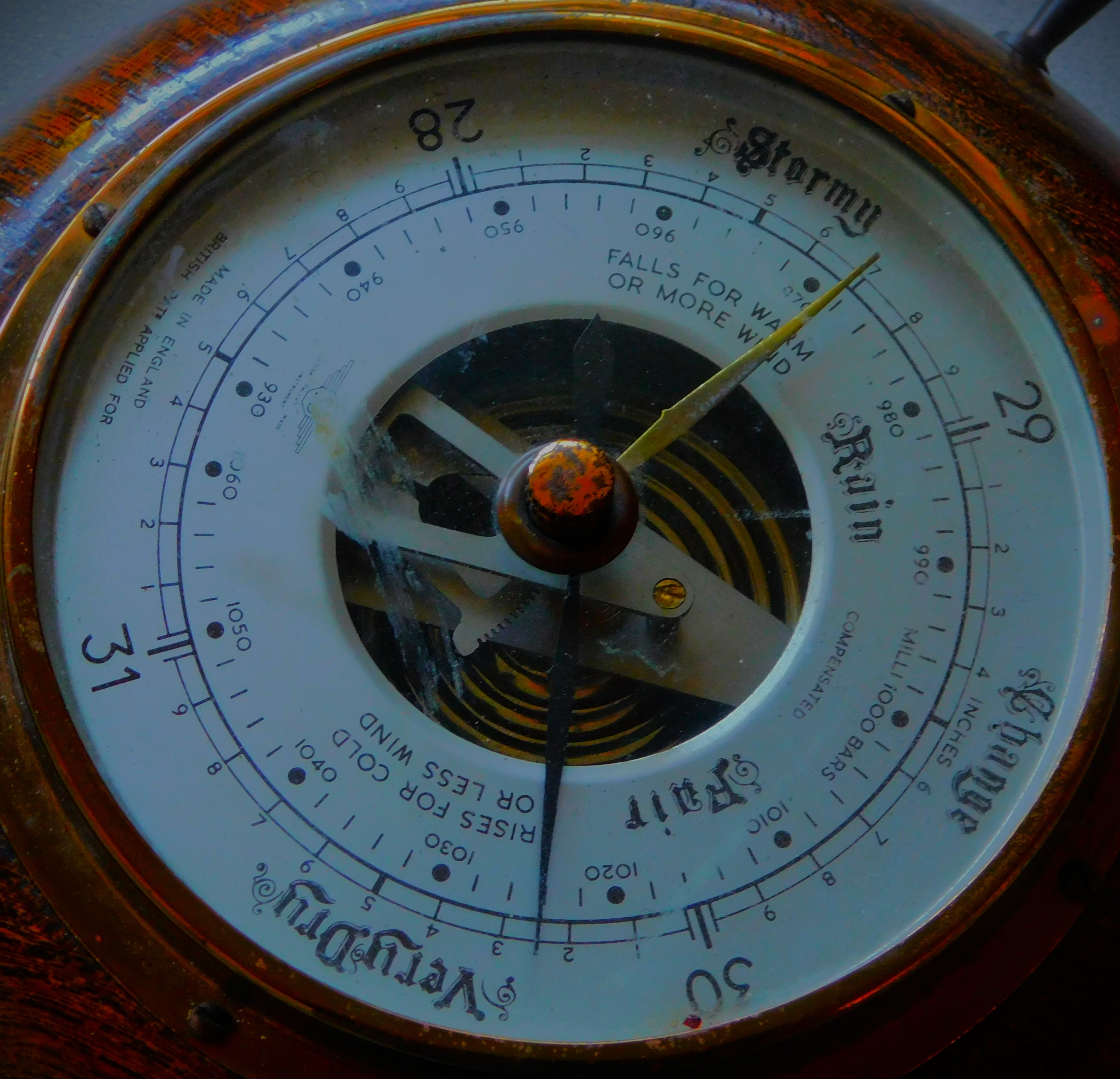The first of four images of the barometer taken in my kitchenThe barometer in its new location, atop my Czech sculpture, which is working admirably as a support for it.Not only did I image all five sleeves of this set, I imaged every locomotive bar one individually.