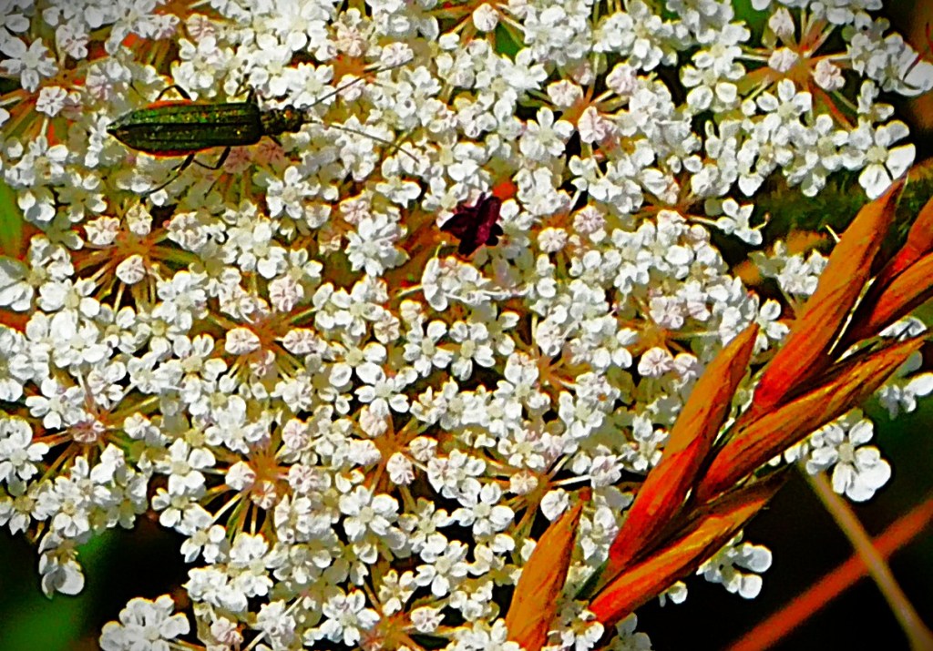 This green beetle (see next image for close up) was enjoying some flowers not far from King’s Lynn train station.This blue winged butterfly was enjoying a yellow plant head in Hardings Pits (four images). There is also a ladybird on the other side of the plant head.A magpie and a muntjac – I think the magpie provides cleaning services for the muntjac which is why it is allowed to perch on it.