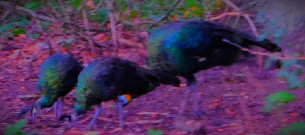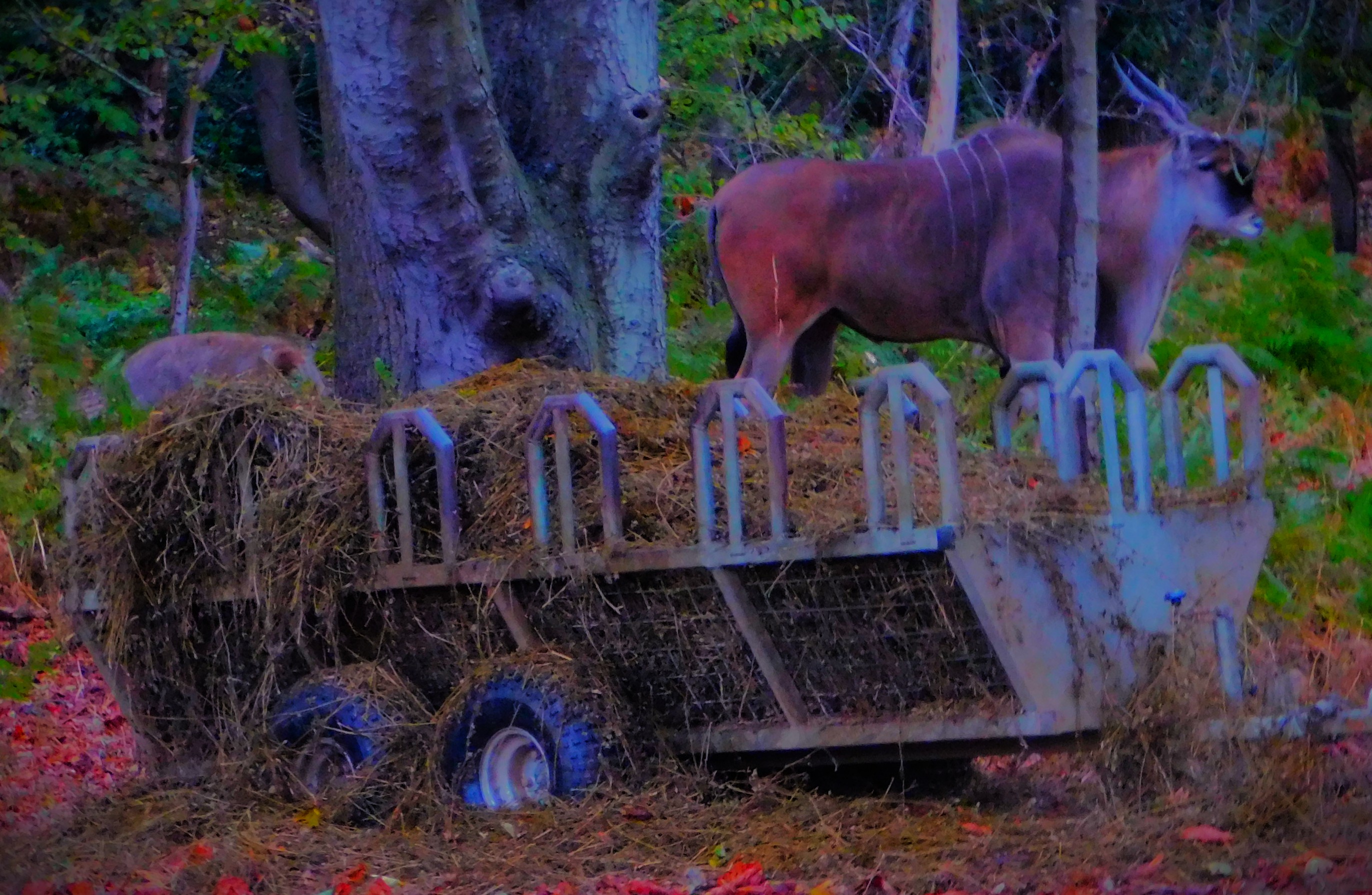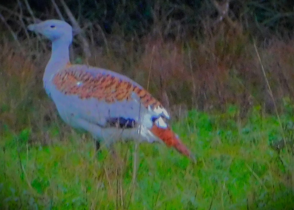 Some of the buggies – note that as we were a group of three ours was smaller than most of these.Great Bustard male.Javan peafowls – these are very rare, so the two chicks are big news.Watatunga’s largest resident, a one ton Cape Eland and its satellite, a Nilgai (only the latter’s back is visible). These two species could never meet in the wild since they live on different continents.Eurasian CranesA roan antelopeThe roan antelope.An eastern bongo (the silvery stripes identify it) with a pair of Eurasian cranes in the foreground.Guinea fowl – the light was fading by this point.