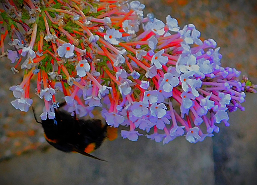I have previously been guilty of mislabelling this – it is not a Cinnabar Moth, it is a six-spot Burnet Moth.This picture and the next, a close up focussing on the insects (two six-spot Burnet moths and one large buff tailed Bumblebee) have already had some success on Mastodon.A dragon fly balanced on a leaf overlooking one of the sections of the Gaywood in The Walks.A precarious resting spot – this reed is entirely surrounded by the waters of the Gaywood, near Eastgate Bridge.