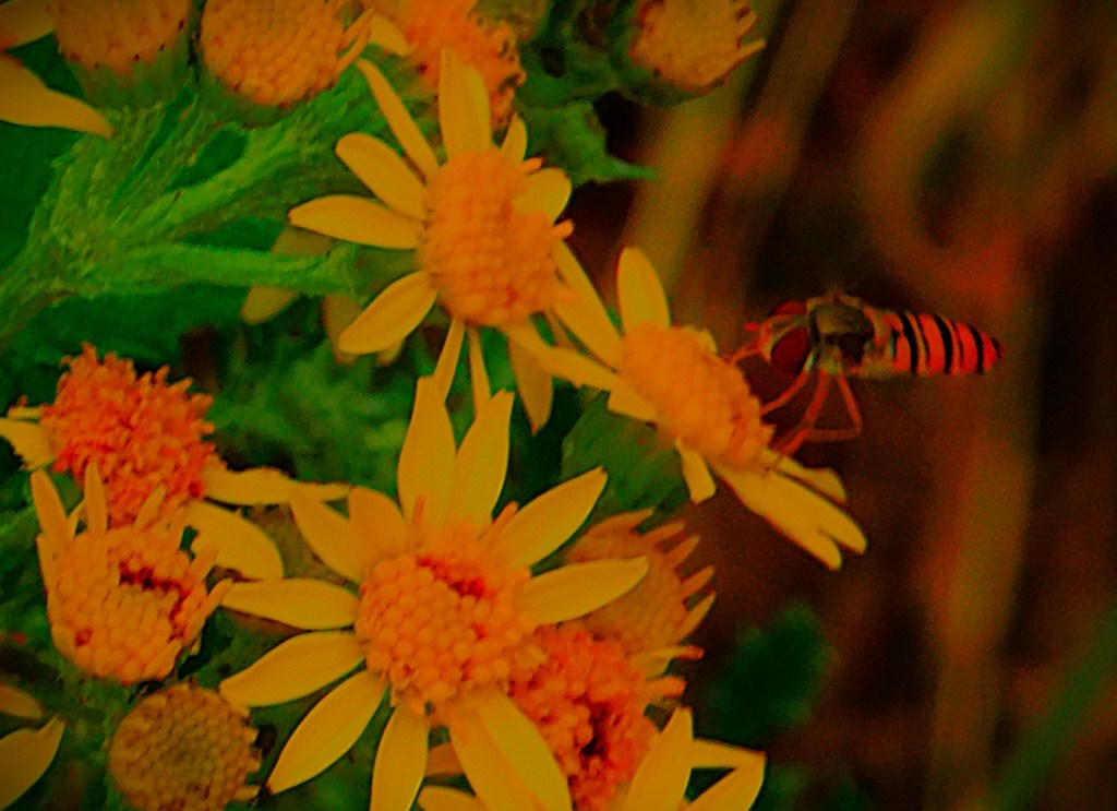 Five hoverflies in one frame – three on the large dandelion head and two hovering nearby.