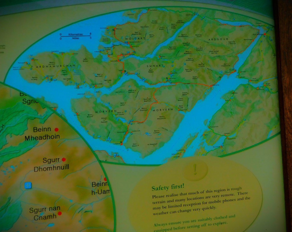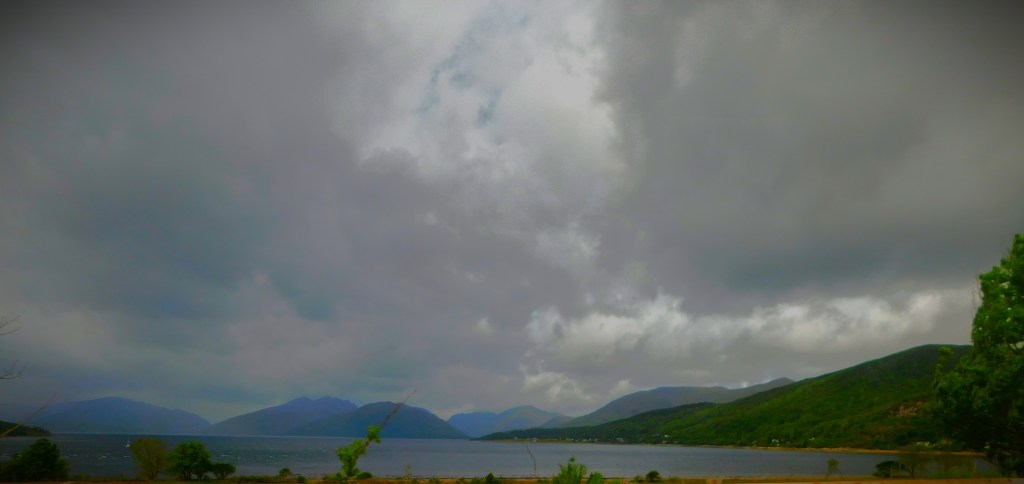 Though there were a few minor issues with the journey from Callander where we had overnighted on to Achosnich where we are staying for the week there was nothing to compare with the upheavals of day one. There are two land routes to the far west of Scotland, the direct route that involves using the Corran ferry and the longer route by way of Fort William. We had opted for the Corran ferry route, and until 12:20, by when we were very close to our destination there were no problems. It was then that we hit a delay in the form of a temporary road closure. Fortunately, the village of Strontian (where the metallic element Strontium was discovered in 1790 – like the four elements Ytterbium, Yttrium, Terbium and Erbium, all named for Ytterby in Sweden where they were discovered, the element is named for the village) was only a few miles behind us, and it numbers a cafe among its amenities, and since the road was reopening at 1:30 filling in the necessary amount of time was less of a drag than it might have been. Once the road reopened it took us a couple of attempts to locate the property, but we got there in the end.