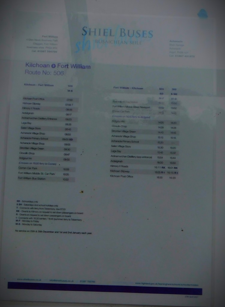 We investigatred this walk early in our journey, but it was not that impressive.The Corran lighthouse, visible from many angles while crossing on the Corran ferry.Information boards at Strontian (five pics)Internal decor at the cafe (four pics)Pictures from the Strontian river (nine in total)Even a place as remote as Strontian has a bus route.This is the Paddle Steamer Waverley – there will be much more about this vessel and its history in later posts.Some pictures from the house at AchnosnichI ventured out for a walk later that afternoon.